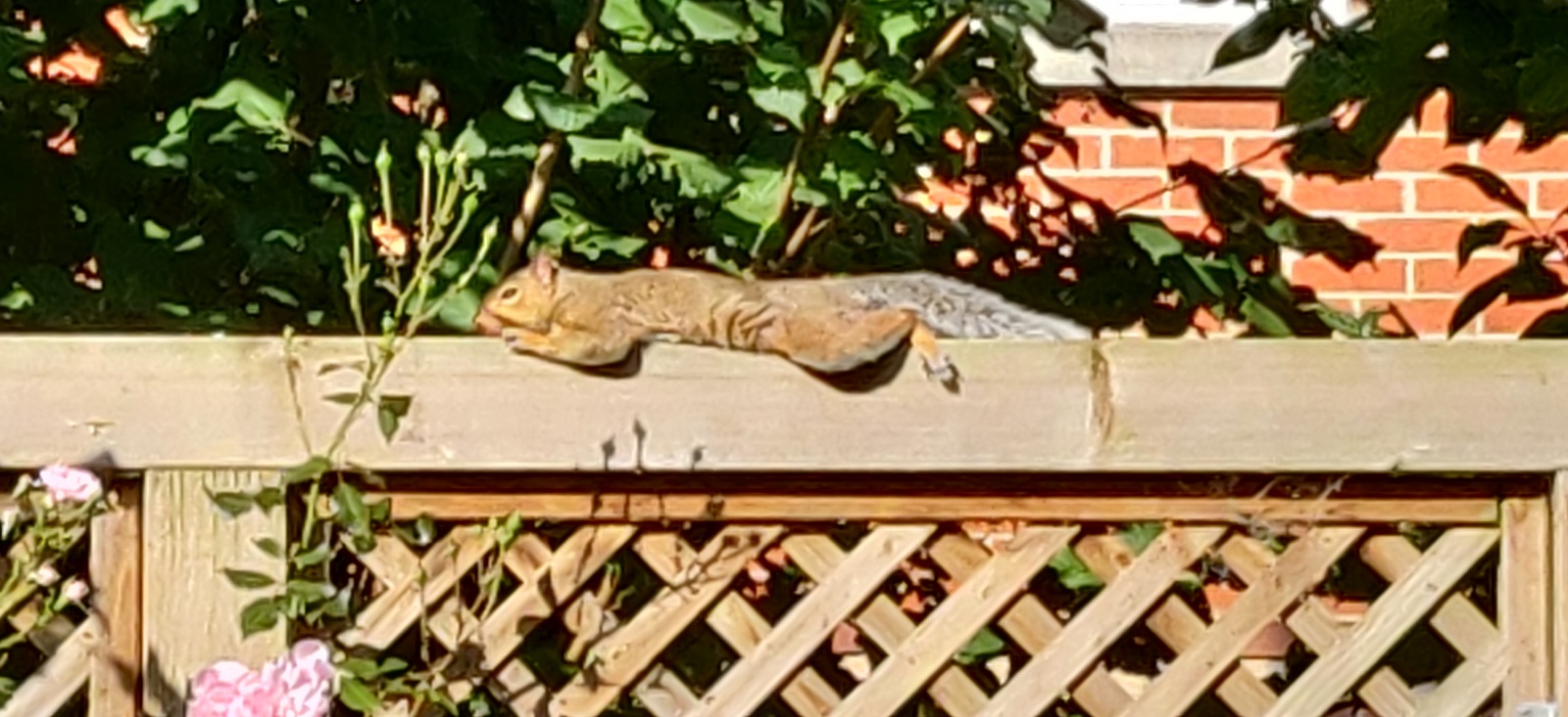 We found this squirrel in our back garden it seems to be sunbathing. Oh and I almost forgot it responds to the name Choo choo.